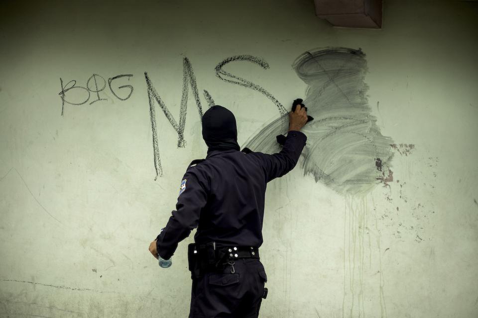 A police officer erases MS13 graffiti in Zacatecoluca. In El Salvador, erasing gang graffiti is taken as a sign of disrespect, and can cost someone their life.